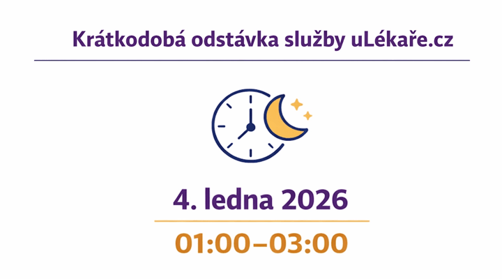 Upozorňujeme vás na to, že 4. ledna 2026 v noční době od 1:00 do 3:00 bude kvůli aktualizaci softwaru a technickým úpravám krátkodobě nedostupná služba uLékaře.cz, která je součástí Asistenční služby OZP.