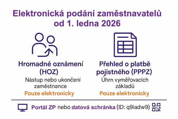 Od 1. ledna 2026 musí podle novely zákona č. 592/1992 Sb. a zákona č. 48/1997 Sb. podávat hlášení zdravotním pojišťovnám výhradně elektronicky také zaměstnavatelé.