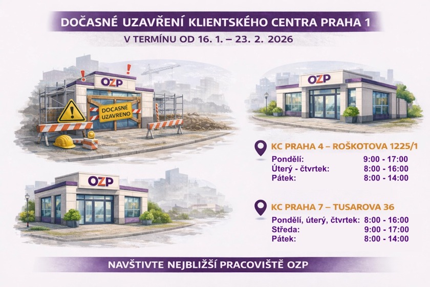 od 16. ledna do 23. února 2026 bude probíhat rekonstrukce Klientského centra OZP v Praze 1, Na Příkopě 24 v pasáži ČNB. Klientské centrum bude po celou dobu rekonstrukce zcela uzavřeno.