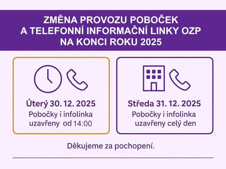 V úterý 30. 12. 2025 budou pobočky OZP uzavřeny od 14:00.